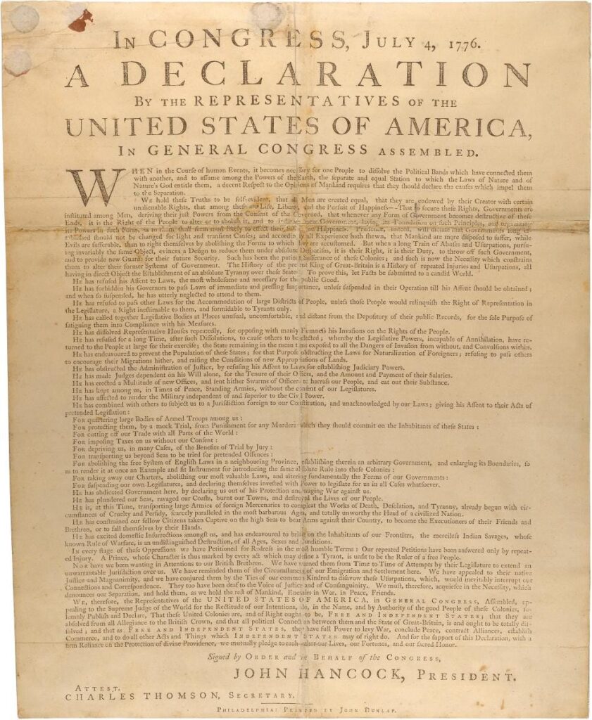 Dunlap, John, Printer, Thomas Jefferson, and United States Creator Second Continental Congress. Dunlap Broadside Declaration of Independence. Philadelphia, Pennsylvania: John Dunlap, -07-04, 1776. Image. Retrieved from the Library of Congress.