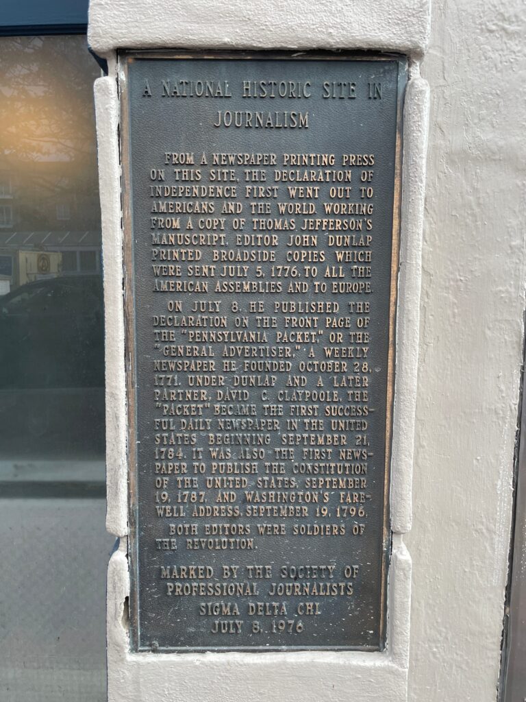 Amazingly, today there is no official marker at the site of Dunlap’s printing shop, on the corner of Second and Market Streets, in Philadelphia. I recently wrote a piece for the Philadelphia Inquirer on the urgent need to put up a sign at the spot of the most important printing job in American history (it’s paywalled, unfortunately, but if you have an Inquirer subscription, enjoy). There is an old, tarnished plaque on a building on the site, put up for the Bicentennial by the Society of Professional Journalists.