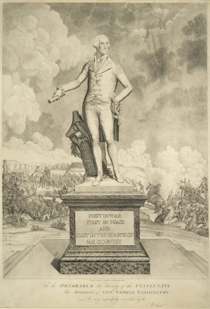 - First in war, first in peace, and first in the hearts of his country : to the honorable the Society of the Cincinnati : this monument of Genl. George Washington is very respectfully inscribed by the artist, John Eckstein, ca. 1806, The Society of the Cincinnati.